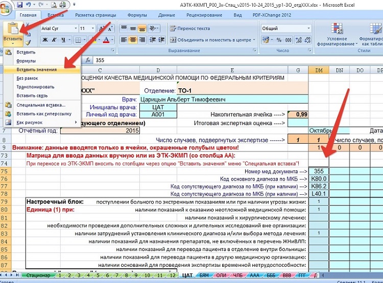 Перенос данных из АЭТК-ЭКМП в АЭТК-ККМП, как мы уже неоднократно указывали, следует производить через меню «Вставить значения», иначе (при простом копировании) в АЭТК-ККМП вставятся формулы вместо значений.